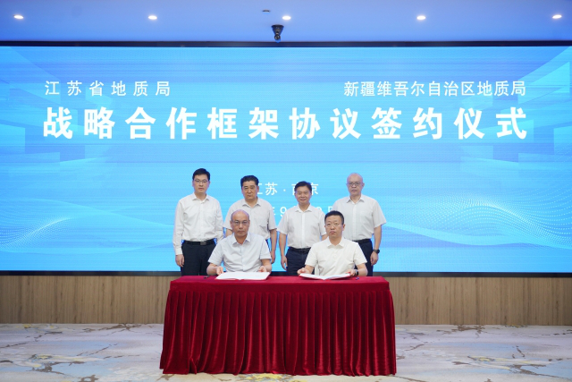 9月19日,江苏省地质局与新疆维吾尔自治区地质局签署合作协议。省自然资源厅党组成员、副厅长,局党委书记、局长程知言,新疆维吾尔自治区自然资源厅党组成员,新疆维吾尔自治区地质局党组书记、副局长黄雪伟出席签约仪式并致辞。局党委委员、副局长戴斌主持仪式。新疆维吾尔自治区地质局党组成员、副局长李宪海,局党委委员、副局长余新明代表双方签约。省自然资源厅地勘处处长、一级调研员叶黎伟出席并介绍了我省地质援疆工作推进情况。
